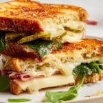 - Assemble the Sandwich: Take the cheesy bread slice out of the oven and top it with the pickled jalapeños. Spread the other plain bread slice evenly with grainy dijon mustard, then drizzle honey on top. Layer the sliced honeycrisp apple, red onion slices, fresh arugula, and kettle potato chips over the mustard-honey slice.