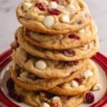A stack of about seven round cookies sits on a white plate with a red edge, each cookie golden brown and studded with white chocolate chips and dried red cherries throughout. The cookies have a soft, slightly chewy texture with some cracks on the surface, the white chips and red cherries contrasting sharply against the warm cookie dough. The plate is placed on a white marbled surface. photo taken with an iphone --ar 4:5 --v 7